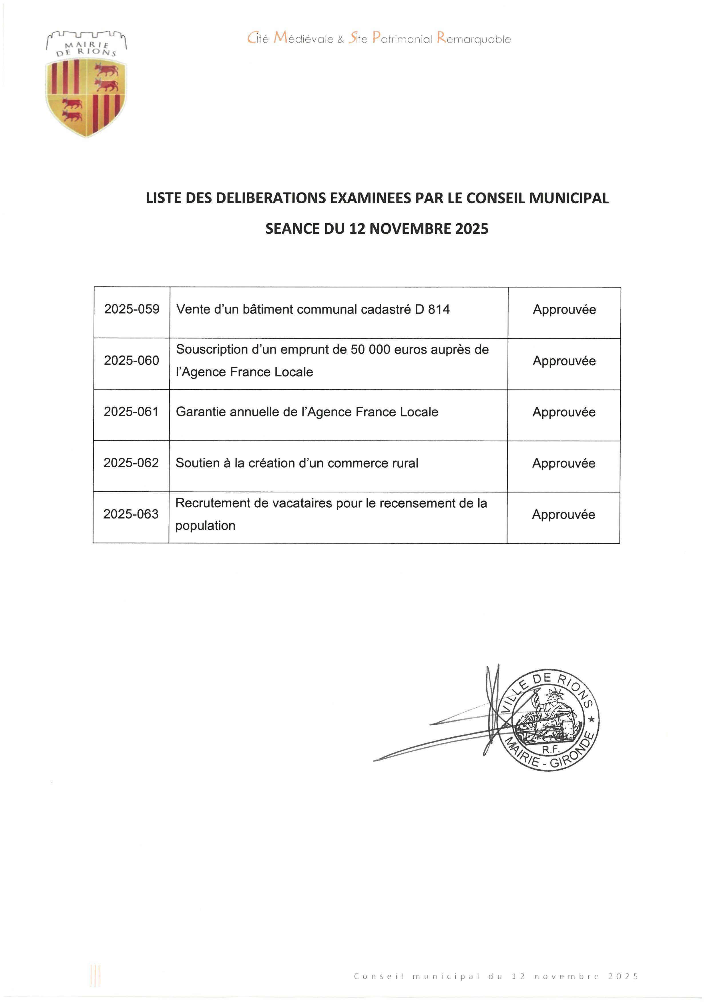 Conseil Municipal du 12 novembre. Liste des délibérations approuvées